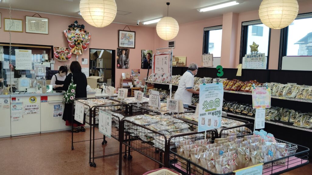 昭和9年に東京で創業しました。当社の初代、祖父は明治生まれ。出身は三重県津市ですが、東京のお煎餅屋さんに丁稚奉公に行っていました。その後結婚をして、東京の巣鴨にお店を構え、ずっと東京で商売をする予定だったのですが、戦争がひどくなり、津市の親戚が疎開をすすめ、家族全員で引っ越しました。そして、当時は野田商店という屋号で、親戚と家族でお煎餅屋さんを家業にしました。関東は煎餅ですが、関西はあられ文化ですので田舎あられをメインにつくっていました。最初は家の一角に会議机2本ぐらいおいて始めたそうです。昭和56年頃に自宅の応接間を店舗に変えて、その頃まだお客さんは少なかったのですが、口コミでだんだん増えてきて、車を停める場所がない、どうしよう、ということで、今の場所に移りました。店舗だけではなく、工場もここに建てました。